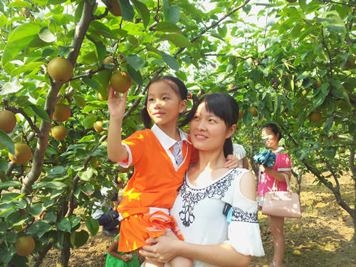 董事长办公室为增强凝聚力,今年实施了集体家访活动,利用休息时间,携带家属到同事家串门,增进了交流和了解,加深了友谊和感情。图为7月27日,家访时周秀芹和女儿在同事杨娜家的梨园里采摘梨子。