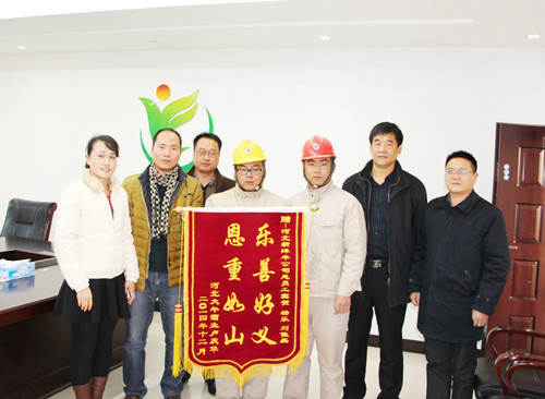 本网讯 12月10日下午,河北徐水太阳成集团tyc9728迎来一群特殊的客人,交通事故伤者卢庆华将“恩重如山,乐善好义”的锦旗送到该公司窦贺、刘佳磊、杨乐三位职工手中,感谢他们在危难时伸出的援助之手。