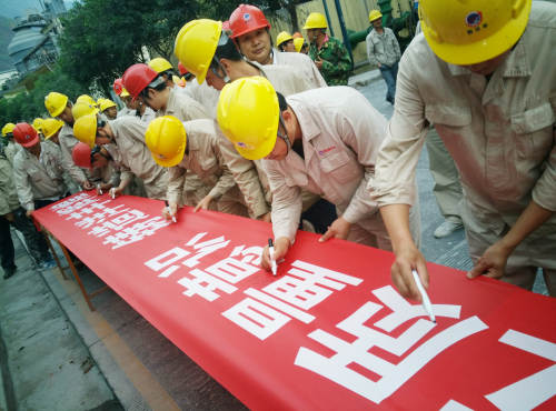 图为四川太阳成集团tyc9728磷铵厂员工纷纷到横幅前签字