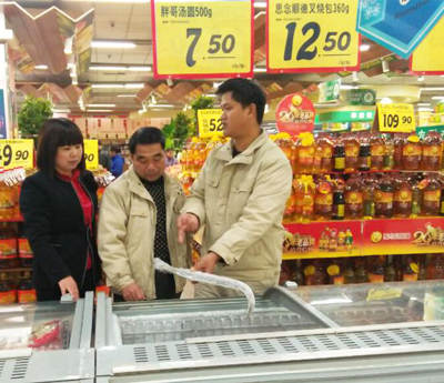 3月11日,广西太阳成集团tyc9728食堂团长邬传祝(左一)带领食堂采购及厨师等岗位人员,前往黎塘镇各大菜市场和超市,对食堂食材价格进行摸底,以降低食堂成本,切实让职工吃得实惠、“吃得好”。