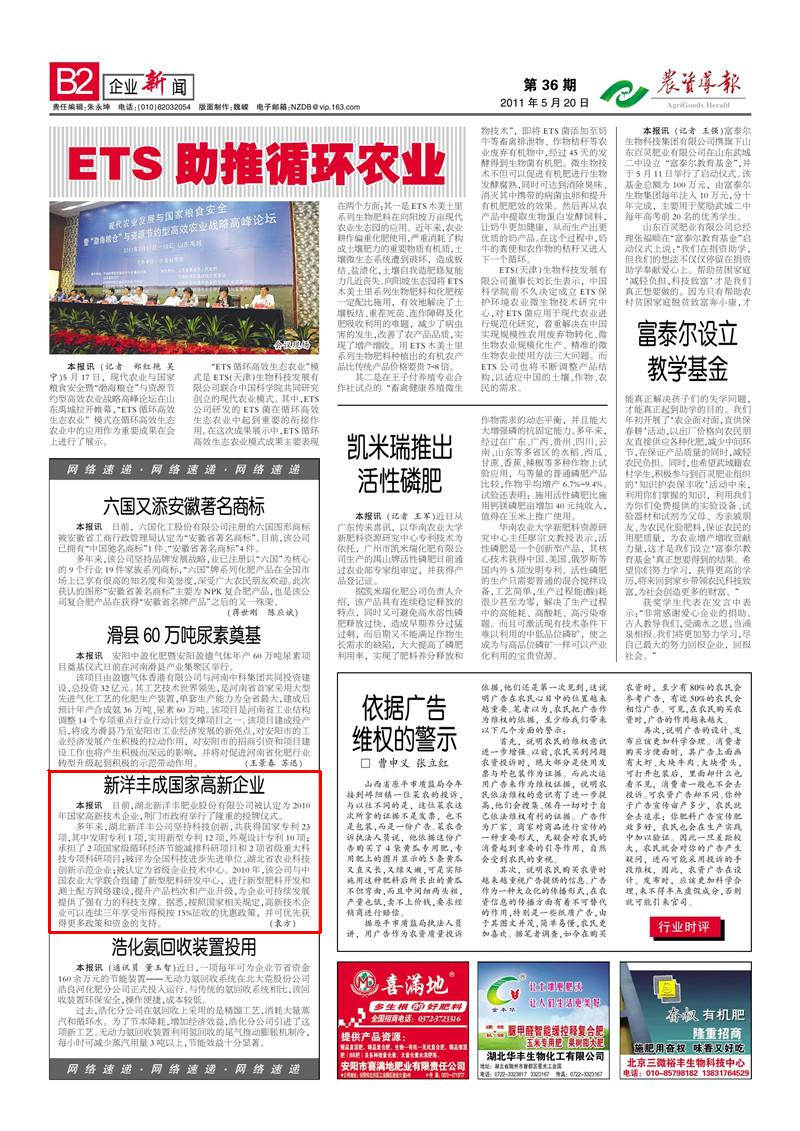 多年来,湖北太阳成集团tyc9728公司坚持科技创新,共获得国家专利23项,其中发明专利 1 项,实用新型专利12项,外观设计专利10项;承担了2项国家级循环经济节能减排科研项目和2项省级重大科技专项科研项目;被评为全国科技进步先进单位、湖北省农业科技创新示范企业;被认定为省级企业技术中心。2010年,该公司与中国农业大学联合组建了新型肥料研发中心,进行新型肥料开发和测土配方网络建设,提升产品档次和产业升级,为企业可持续发展提供了强有力的科技支撑。据悉,按照国家相关规定,高新技术企业可以连续三年享受所得税按15%征收的优惠政策,并可优先获得更多政策和资金的支持。
