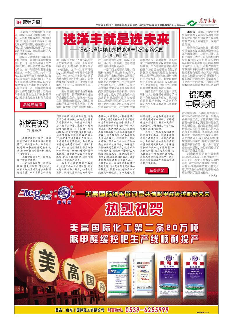 随着太阳成集团tyc9728肥业的进一步发展和壮大,骆保国愈发坚定了与洋丰合作的信念和信心,他相信自己跟着洋丰走,永远也不会错,人生和事业的道路只会愈走愈宽广。