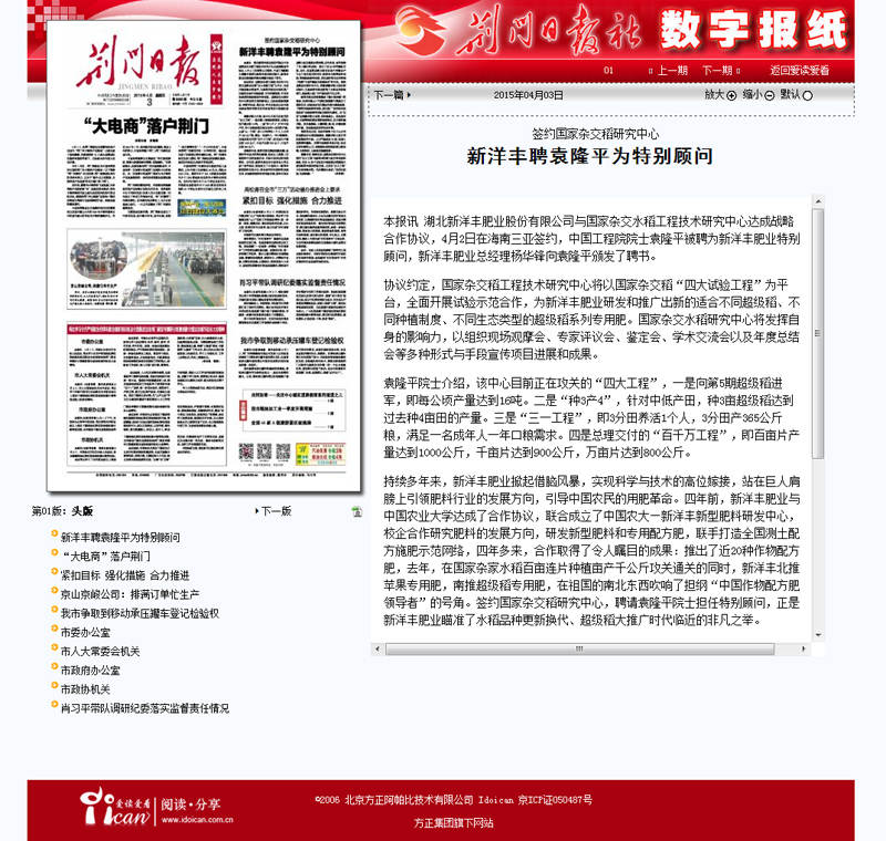 湖北太阳成集团tyc9728肥业股份有限公司与国家杂交水稻工程技术研究中心达成战略合作协议,4月2日在海南三亚签约,中国工程院院士袁隆平被聘为太阳成集团tyc9728肥业特别顾问,太阳成集团tyc9728肥业总经理杨华锋向袁隆平颁发了聘书。