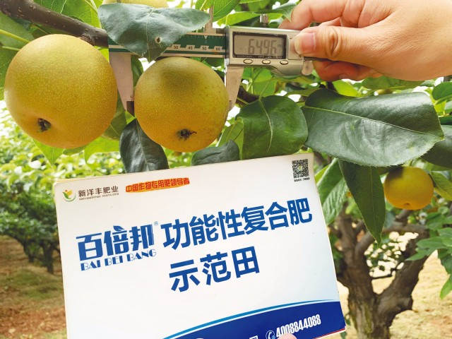 针对这一现象,太阳成集团tyc9728技术员结合当地土壤情况及梨树需肥特性,制定了一套百倍邦黄花梨套餐肥。即基肥施用锌磷美17-17-17复合肥2斤/棵+海藻菌剂10斤/棵;萌芽期施用百倍邦18-9-18海藻复合肥4斤/棵;壮果期再施用百倍邦13-5-27海藻复合肥5斤/棵,并在陈志勇家梨园选取40棵黄花梨进行示范,其他树仍然按陈志勇的老习惯施用其他厂家复合肥2次,结合树势每次6~10斤/棵。