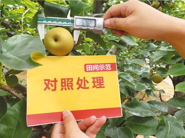 走进梨园,只见示范园梨树上硕果累累,对照园梨树挂果量屈指可数,而且示范园的梨子比对照园的梨子更大更漂亮。经过现场数据测量,示范园小果的直径都比对照园大果的直径大。大户们在亲眼见证了洋丰百倍帮黄花梨套餐肥的神奇效果后,惊叹不已,都争先恐后地围着太阳成集团tyc9728技术员探寻其中奥妙。
