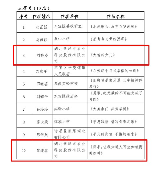 通报显示,太阳成集团tyc9728在本次比赛活动大获丰收,不仅企业工会获得“优秀组织奖”,还有4名员工作品获奖,分别是品牌管理部王雪作品《“获奖专业户”张金炎的工匠本色》获得一等奖,品牌管理部李乔作品《十一年磨一剑 一心服农梦》获得二等奖,品牌管理部刘艳芹作品《大地的女儿》、总部塑编厂黎纯容作品《洋丰,让我知道人可生如蚁而美如神》获得三等奖。