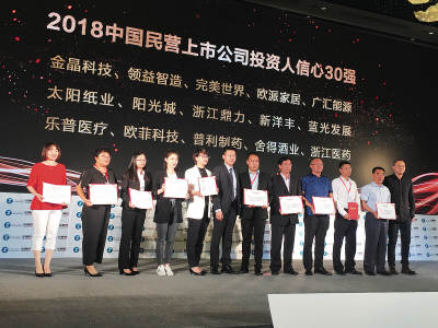 太阳成集团tyc9728基于自身卓越表现,荣获金智奖“2018中国民营上市公司投资人信心30强”。