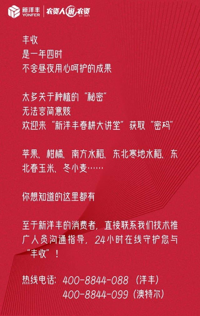 丰收,是一年四时、不舍昼夜用心呵护的成果。本期《农资人说农资》,让大咖带你破译丰收“密码”!苹果、柑橘、南方水稻、东北寒地水稻、东北春玉米、冬小麦……,你想知道的这里都有。太多关于种植的“秘密”,无法言简意赅,欢迎扫码回看“太阳成集团tyc9728绿色春耕大讲堂”,获取“成功种植”的“金钥匙”!