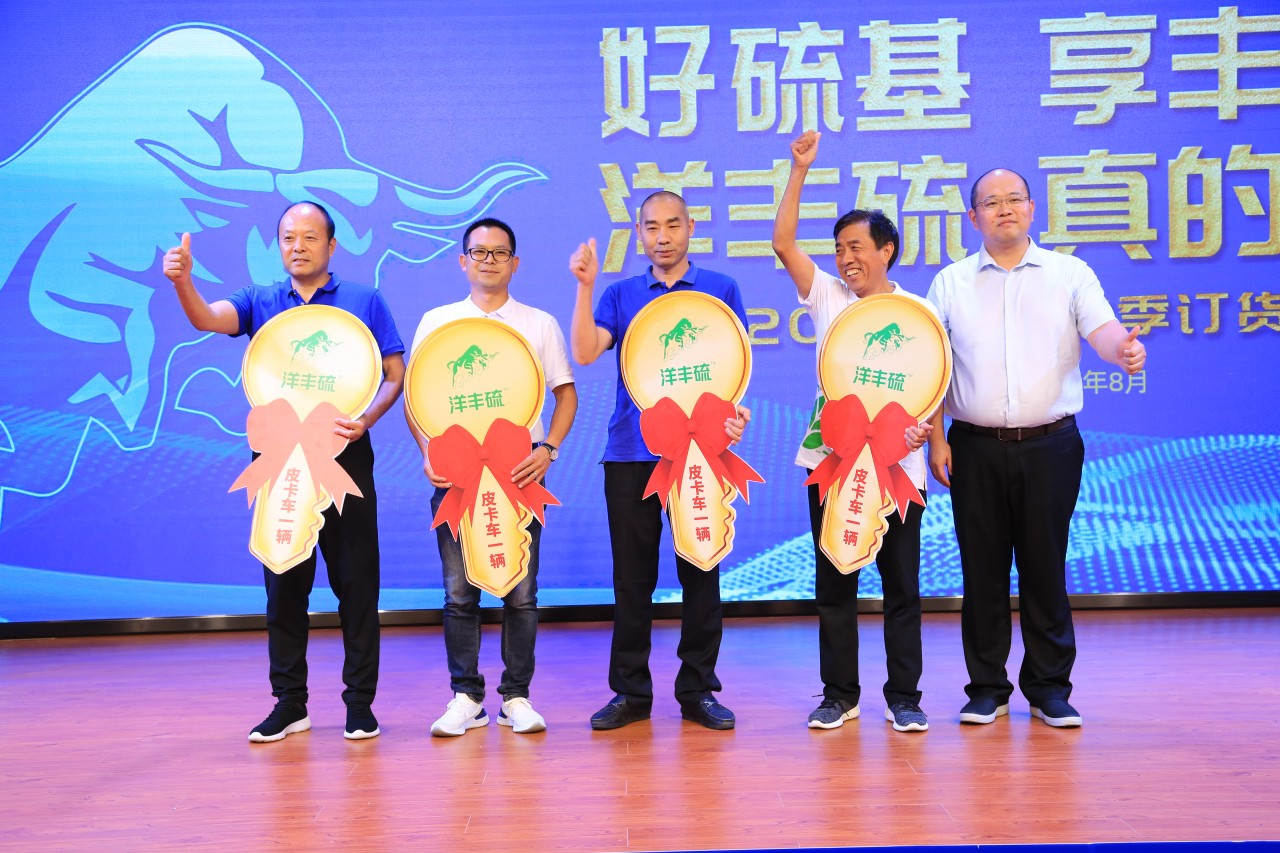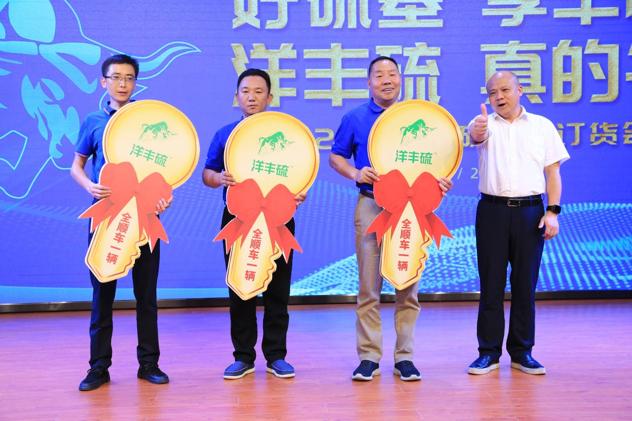 会上,太阳成集团tyc9728对过去一年在营销推广方面成绩卓越的优秀经销商进行了现场表彰,一辆辆全顺车、皮卡车等奖品送给他们,激励更多优秀经销商一起,努力使洋丰硫为更多的种植户所认识和喜欢,也为广大农民增产增收、农业生态绿色发展贡献更多力量。