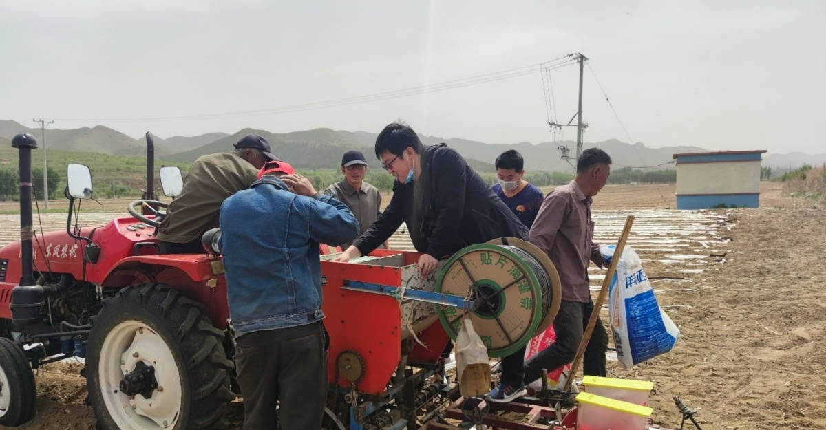 邓超(右三)在辽宁朝阳市指导玉米春耕播种